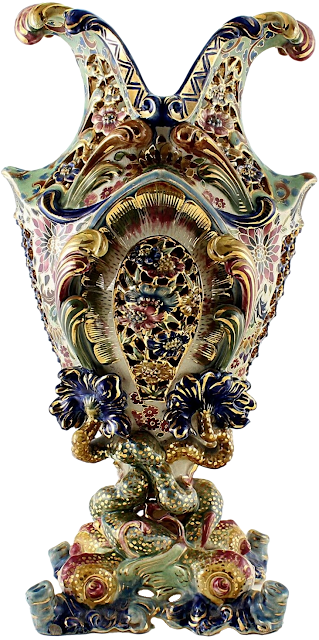 The Hungarian majolica of Fischer is very different in look and character from traditional Western majolica. Instead of deeply molded areas covered with color like that used in France, England and Germany, the colored glaze is applied over a lead base through the freehand drawing of designs and highlighting of areas by talented paintresses. A porcelain base was used for some of the wares, unlike the earthenware of most majolica manufacturers. The tube lined technique used extensively in the West in the production of tiles is a commonly used technique. The application of gold trim. transfer decoration and enamels is also very common. Puzzle jugs and highly ornamental pieces in the Austrio-Hungarian, Turkish and Chinese styles made up the bulk of his ornamental wares. Their decorative approach is often compared to that of Zsolnay.